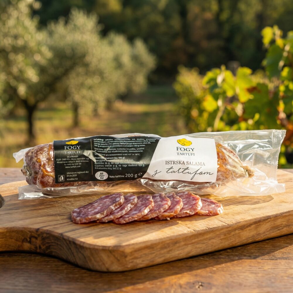 Sestavine: svinjsko meso, sol, posneto mleko v prahu, poper, česen, poletni tartuf (Tuber Aestivum Vitt.) 3%, aroma