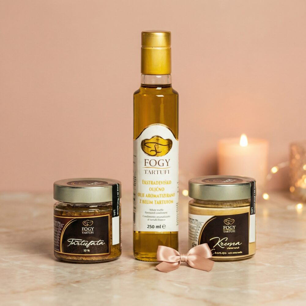TRIS srednji: Tartufata 10% 200g, Bela krema 200g in Oljčno olje z aromo belega tartufa 250ml